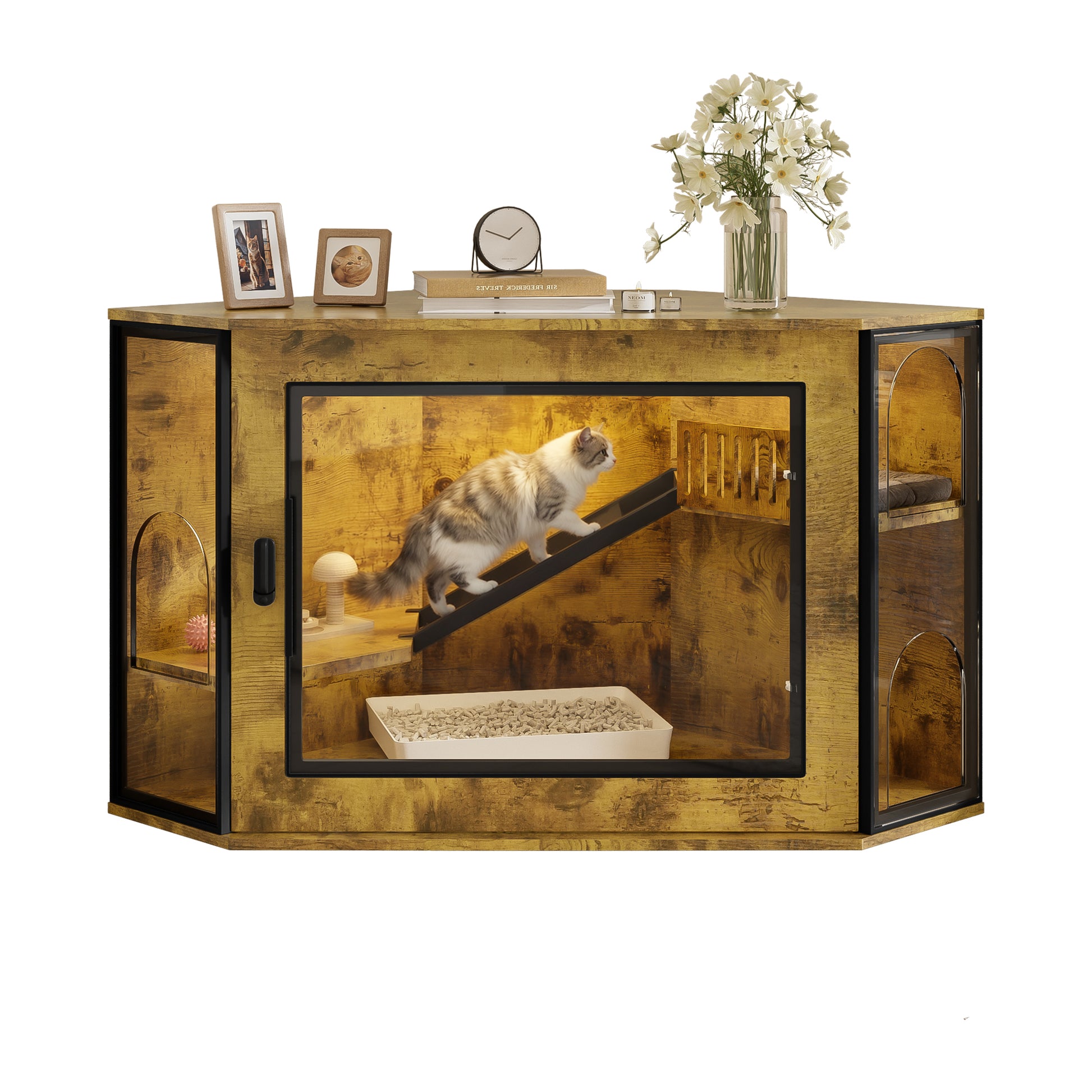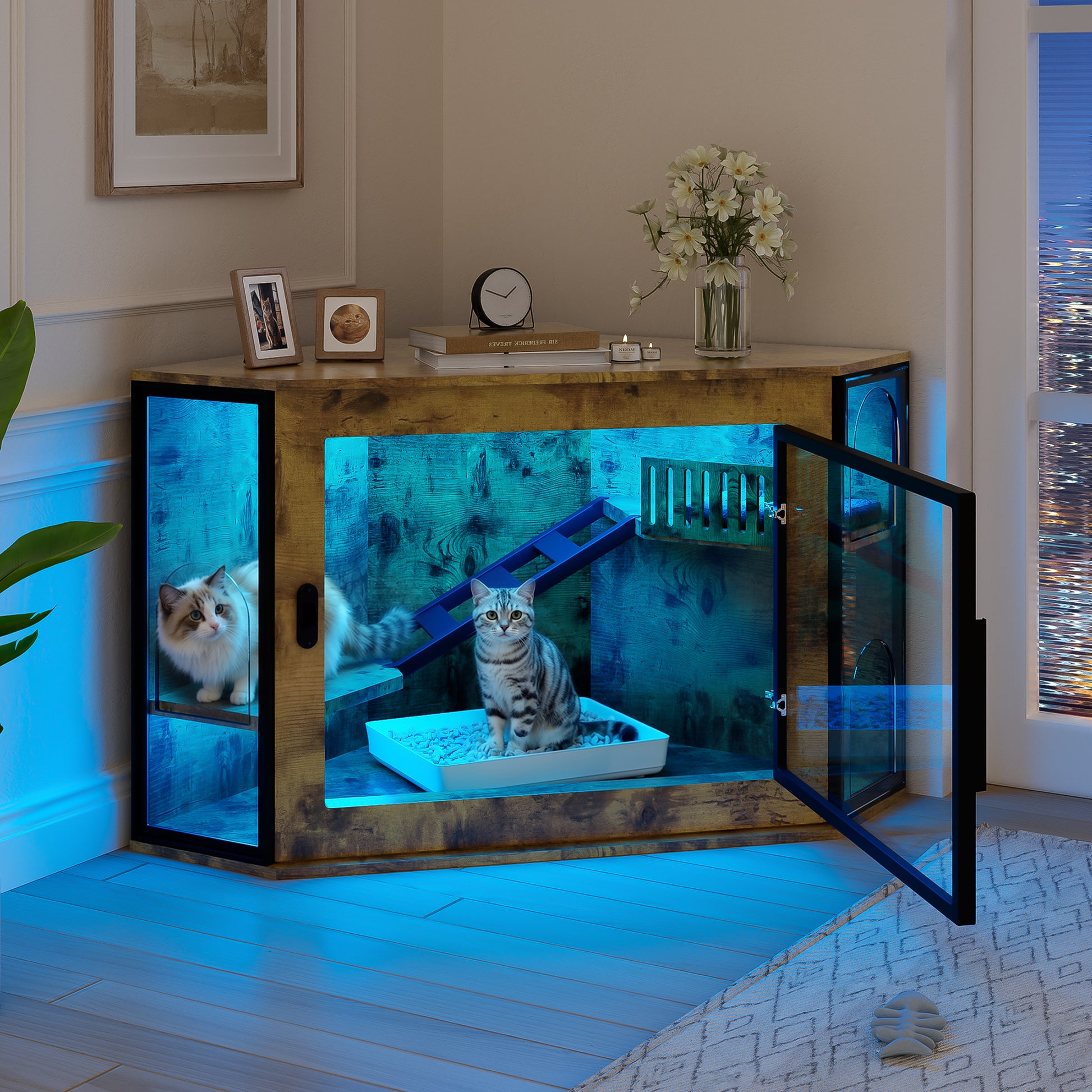 48" Corner Cat Litter Box Enclosure, Modern Hidden Litter Box Corner Cabinet with Acrylic Door and LED Light, Cat House with Playground and Stairs