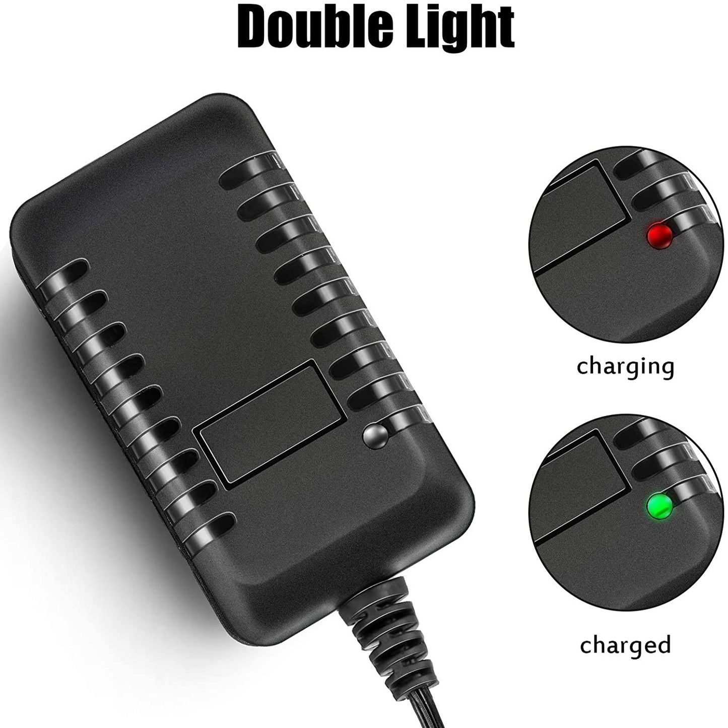 The reusable fast charger can be used to charge 6V children's electric wheels, and the status two color LEDs indicate the charging stage.
