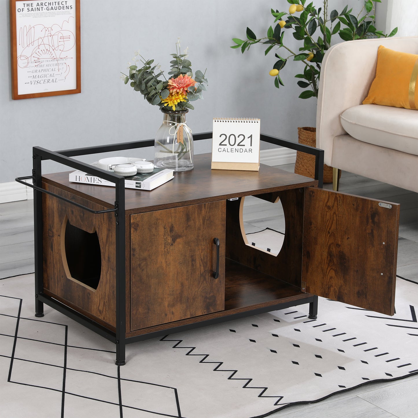 - Classic cat furniture design covers and hides away a litter box while helping seal off smells and messes to keep your home sanitary and clean