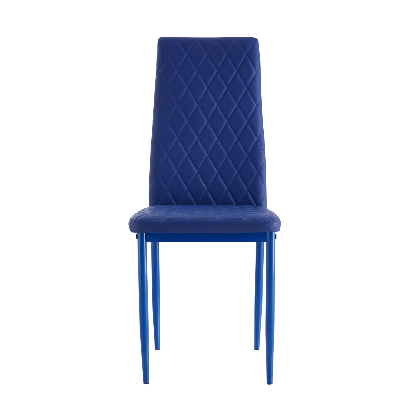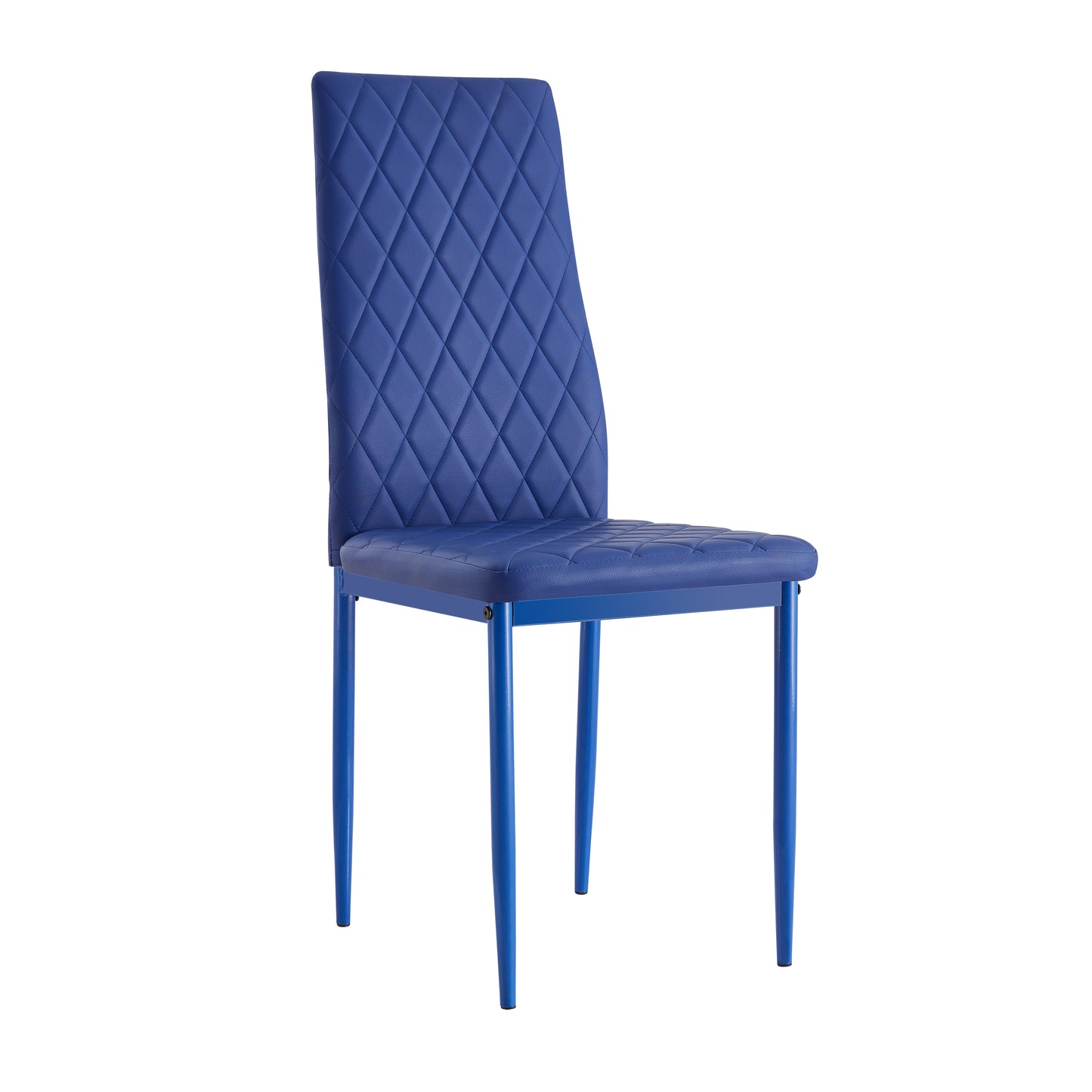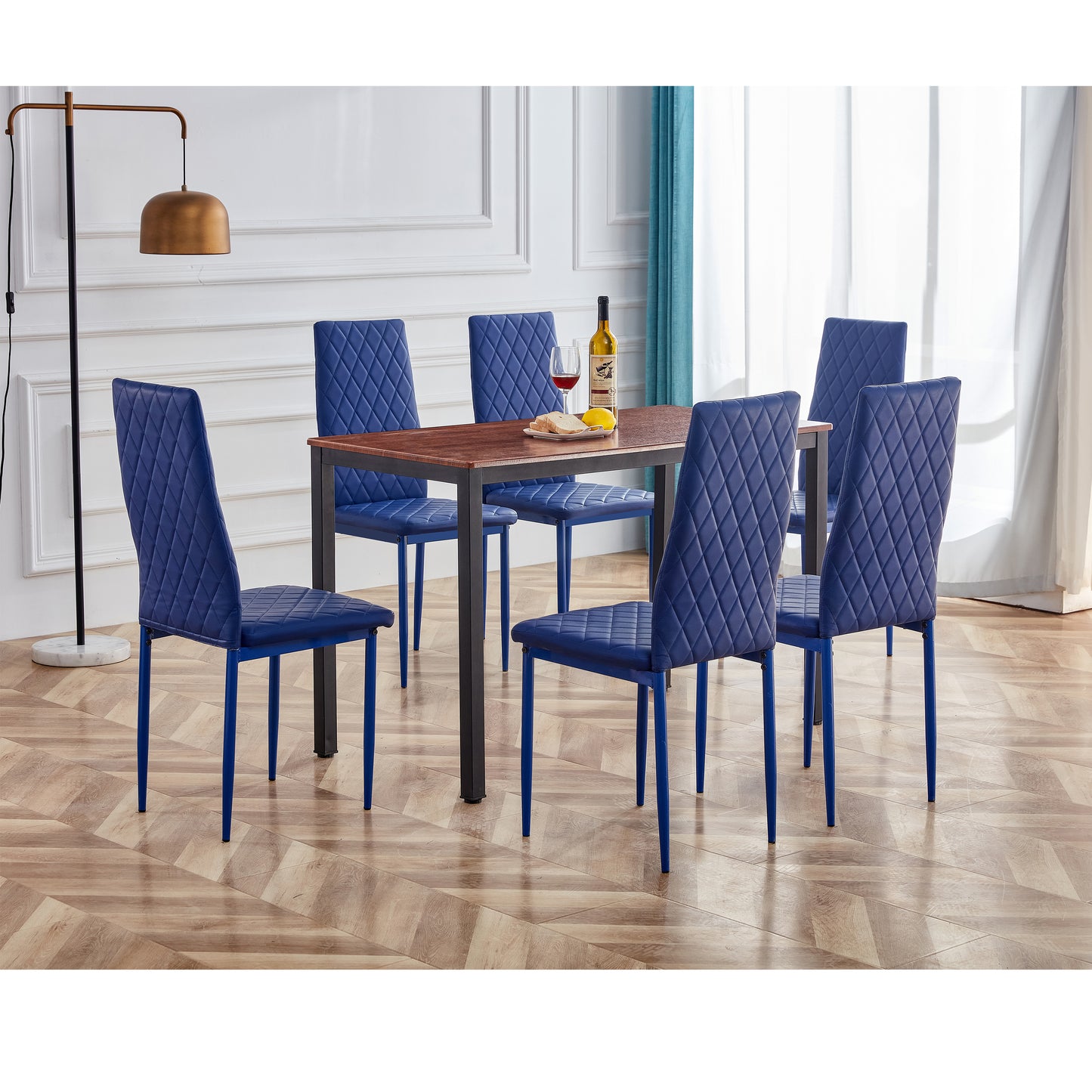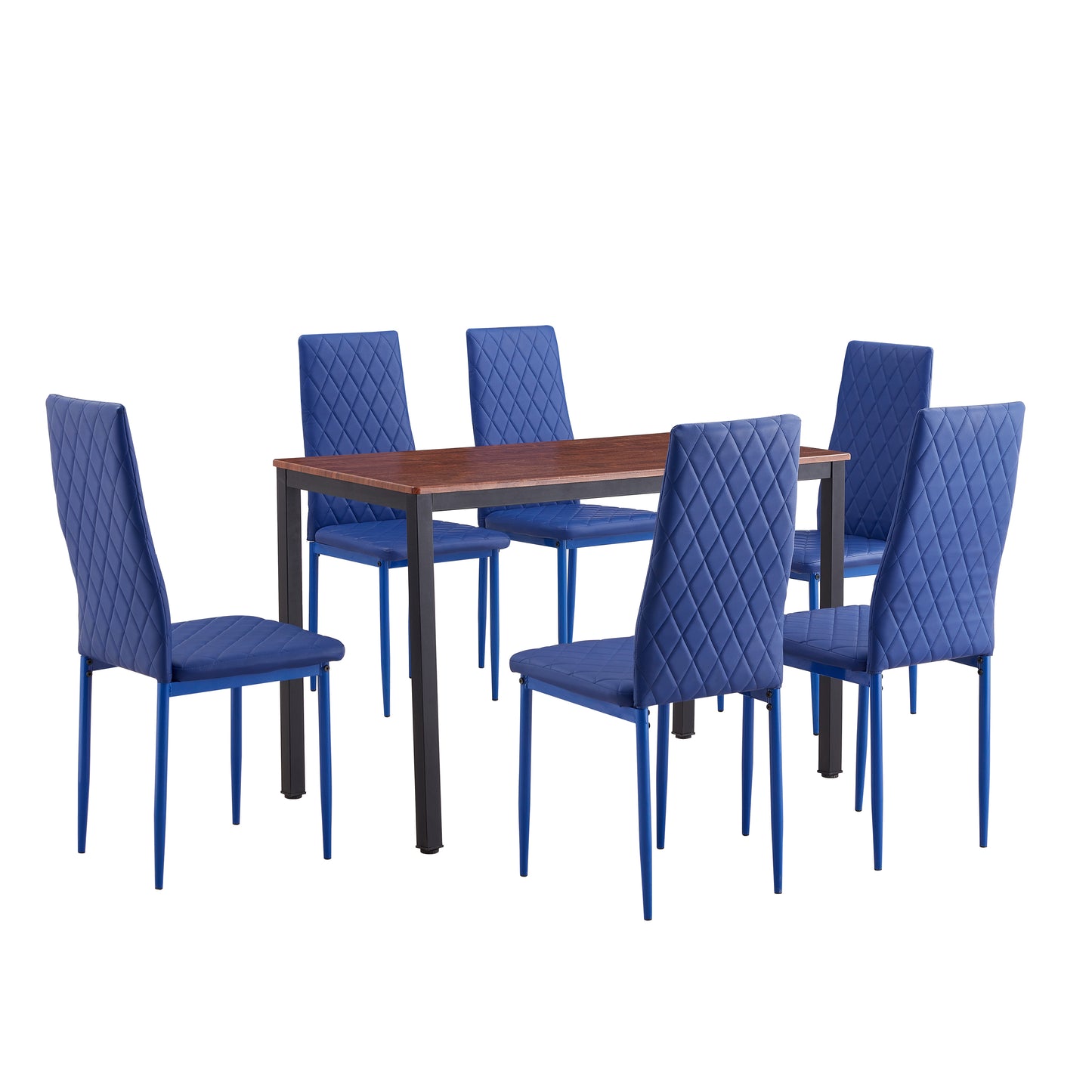 Four-piece dining table and chair set, carbon steel frame with dark brown wood grain table top, simple, elegant and practical, with blue leather dining chair, casual and luxurious, detachable dining table and chair, also suitable for outdoor use.