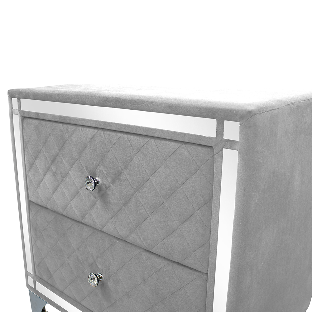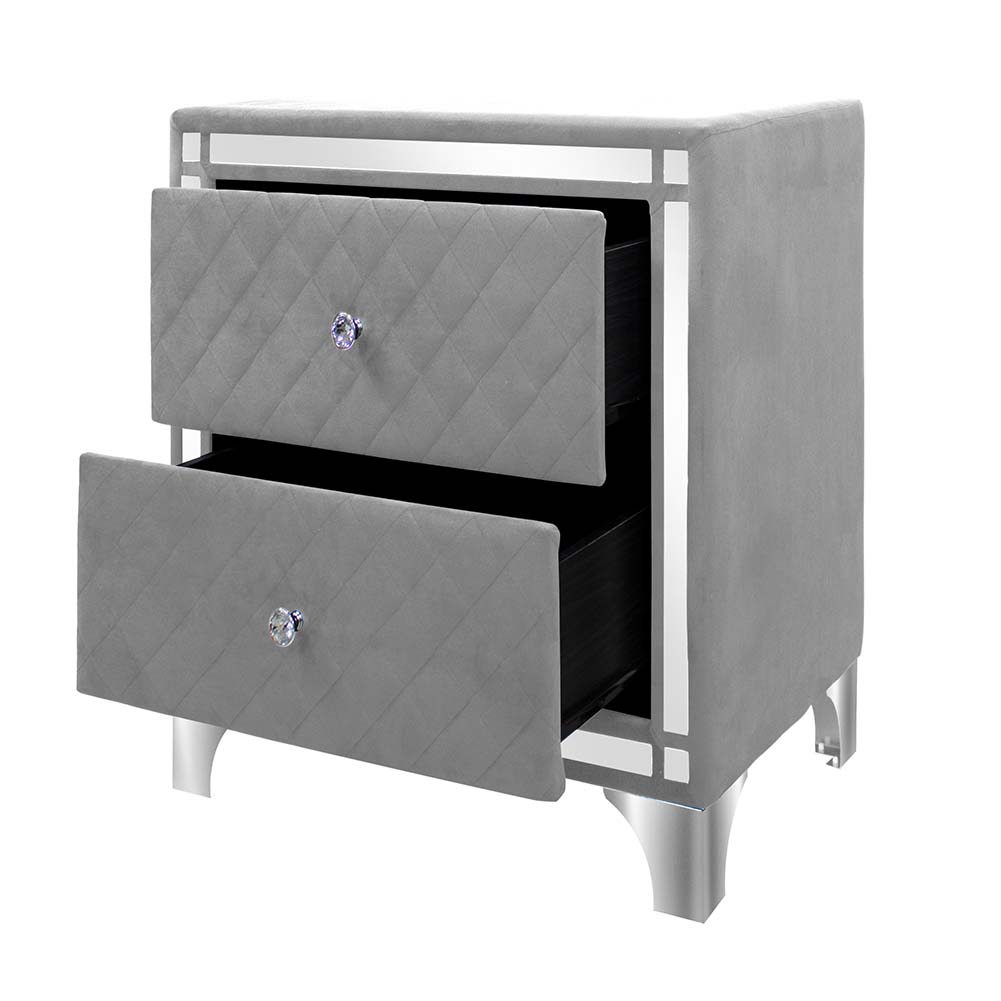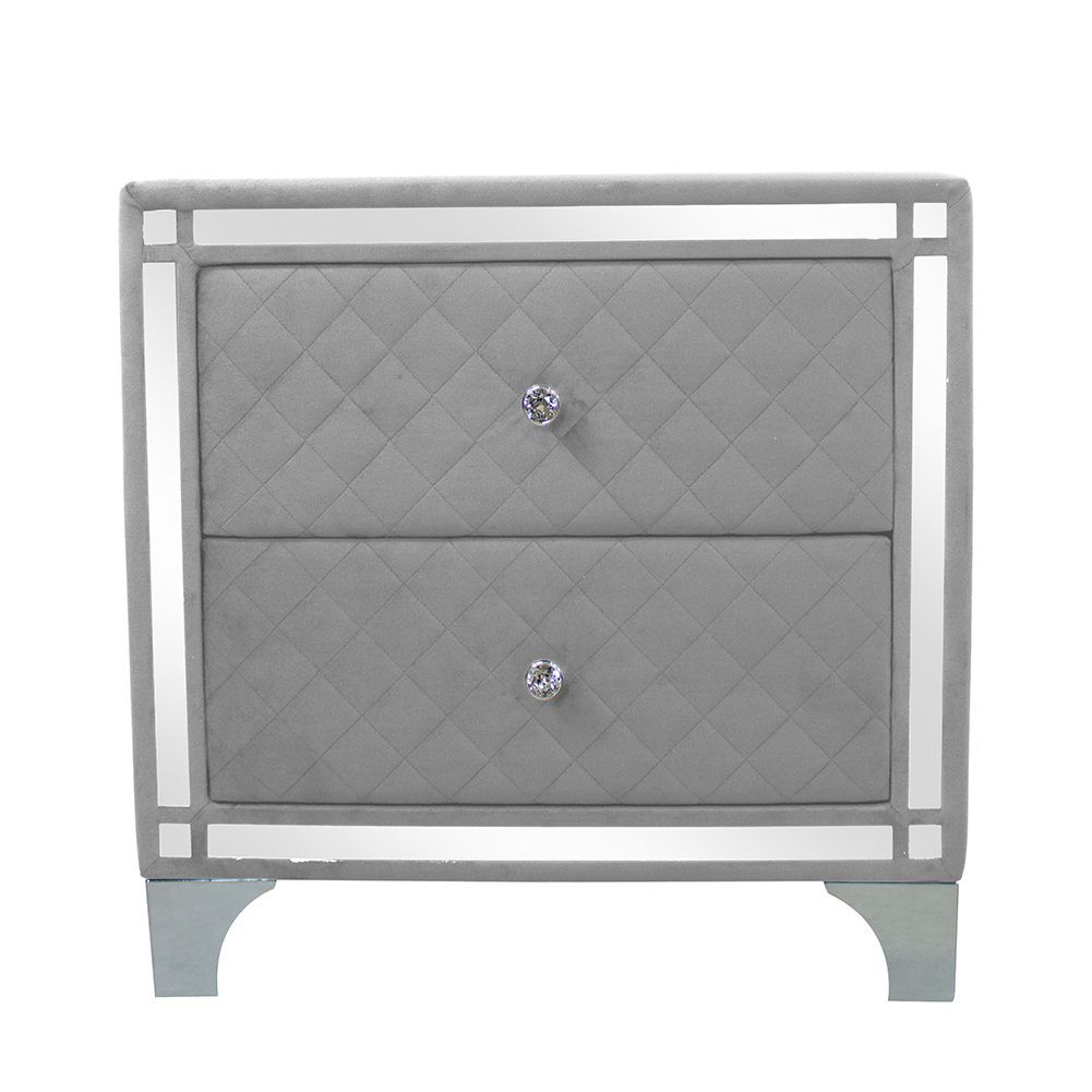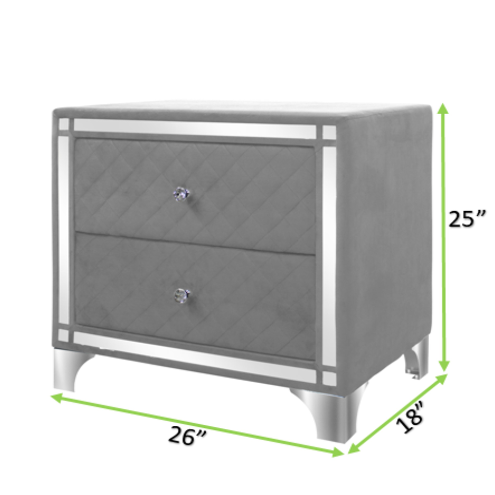 Elegant simplicity starts here. With every detail thoughtfully considered, the stage is set. This bedroom set embodies the new look of inspired luxury. Its tall upholstered headboard is tailored to perfection with LED lights outlined in a wood frame. Glamorous and Classic in every way, this is the bed that lets you dress it up or down whenever the mood strikes. This beautiful bedroom set has an alluring upholstered bed base. The upholstery is a velvet texture with a color that makes this Bedroom unique. This bedroom set comes with a Nightstand. A genuinely magical bedroom in velvet to create your ultimate lair. Every piece is upholstered in plush, soft touching velvet upholstery in diamond shape stitching and tufted with Mirror reflect acrylic strip decoration. This Velvet Upholstery creates a rich texture appearance. The Set is complete with 3 step touch sensor LED lighting on the headboard & Mirror. The additional case pieces carry the same velvet theme with Diamond knob handles that adds to the aura of your Bedroom. Slats are included, so you would not require any additional box spring.