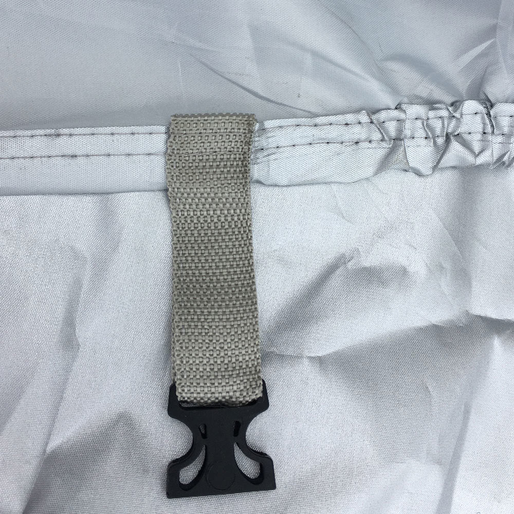 - 【Easy to Use】Strap with buckle at the mid-bottom, it can hold your car cover in place in the car in Rainstorm or Windy weather. Elasticized hem around the corner keeps the car cover a snug fit, and easy to put on and off.