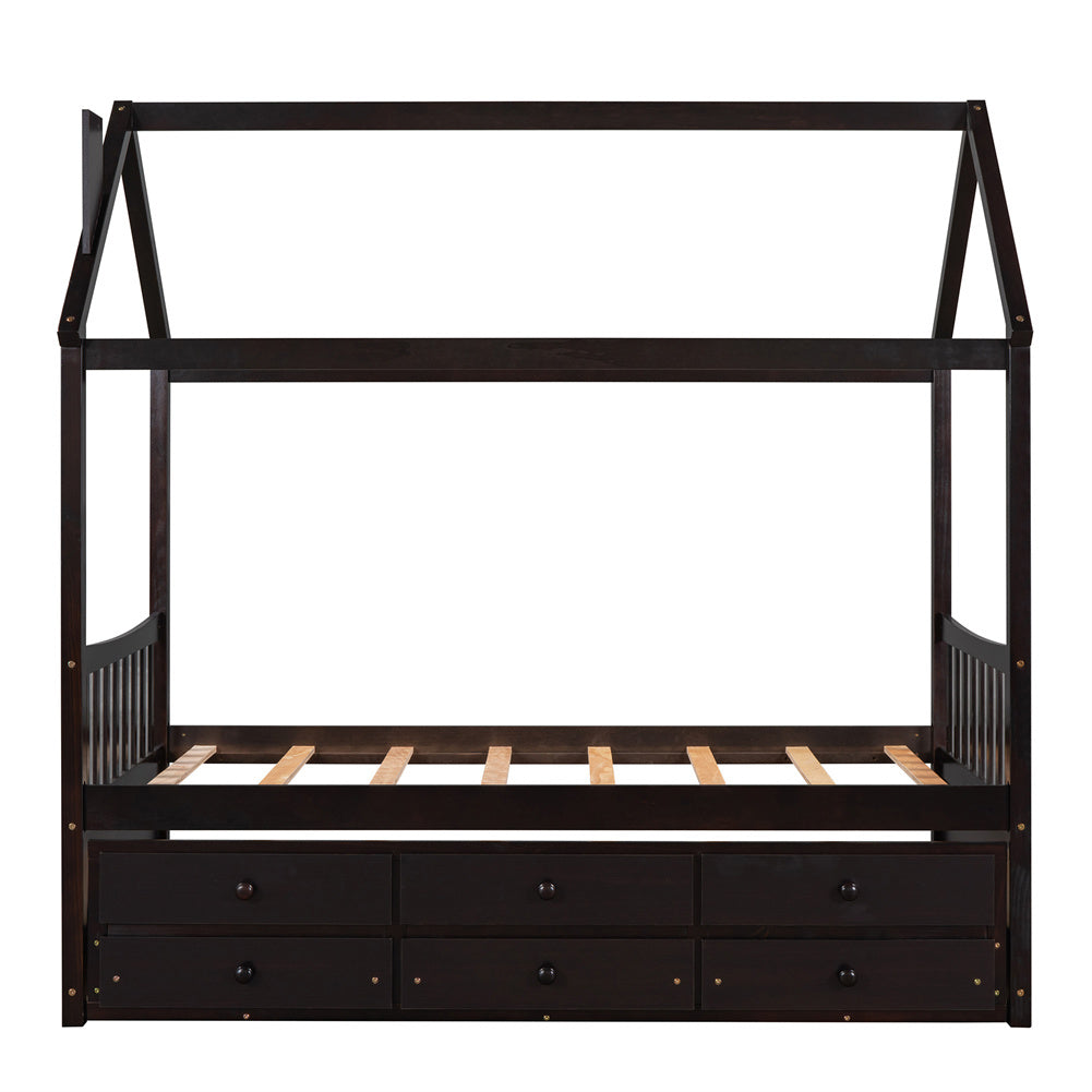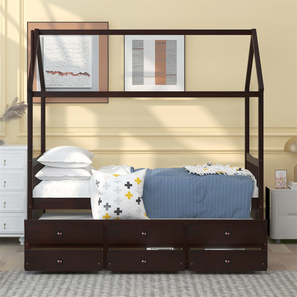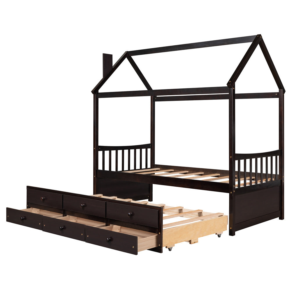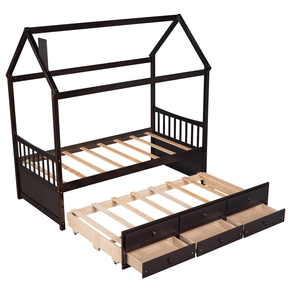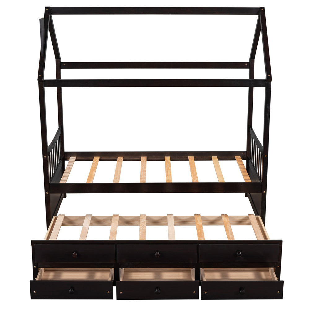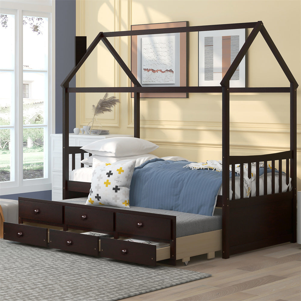 - [Maximized space] The house bed with handy pull-out trundle and three functioning drawers takes up minimal space for the spontaneous sleepover guest. The trundle and drawers can easily be pulled in and out for maximum storage space, perfect for organizing anything from clothes and bed linens to toys and games. Such a versatile piece, bringing functionality, versatility, and style to your home, perfect for those who have lots of visitors.