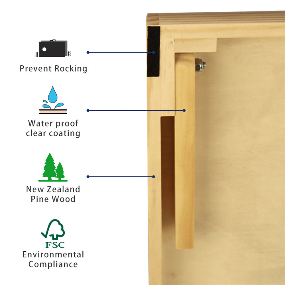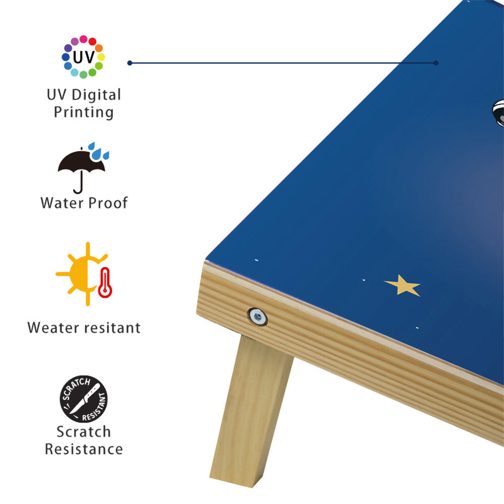 Our boards are made of FSC-certified New Zealand pine A-grade plywood. The board is made with UV digital printing protects against weathering, and the high-quality digitally printed present vibrant and true colors, direct to wood / no vinyl label / no peeling. The surface is processed by special technology to prevent toss bags from dropping on the board. The legs that are painted with waterproof clear coating are firm and not afraid of wind and rain, easy to store and carry. With the perfect centered hole with rounded edges, don't worry about the bag getting stuck. And about the size and net weight, 2′ x 3′ Compact size and approximately 25lb, it's wasy to set up and suitable for everyone. All above, you could see that our design meets the Cornhole Association standards for design, construction, and performance.